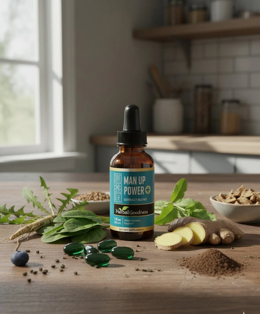 Man-Up Power Liquid Extract is a plant-based formula made with a curated blend of roots and herbs traditionally used in wellness practices.