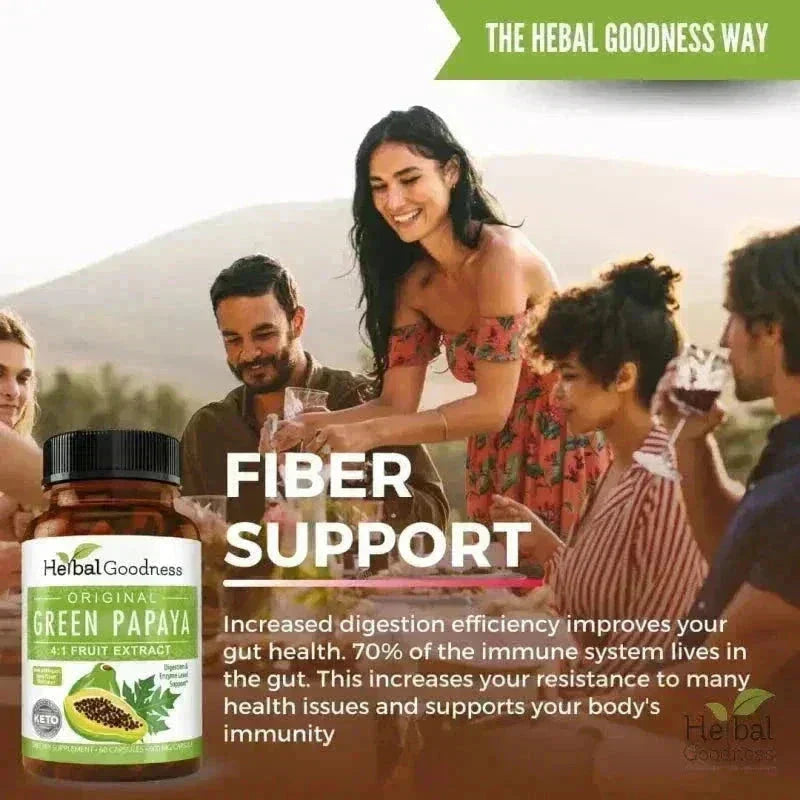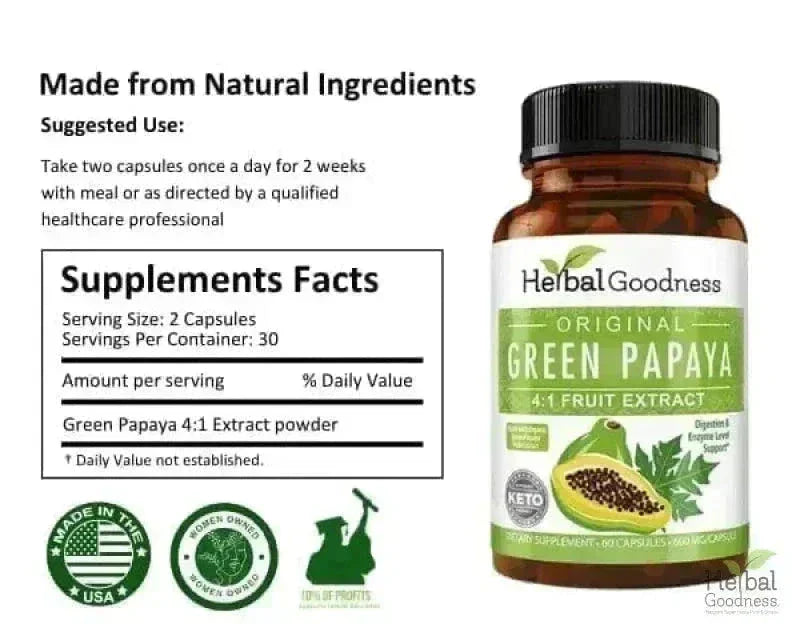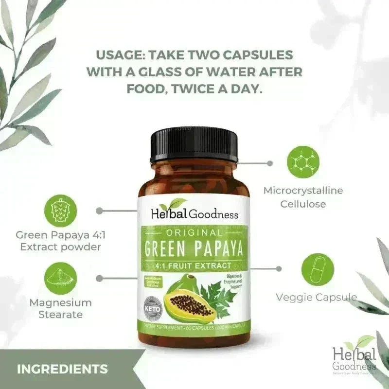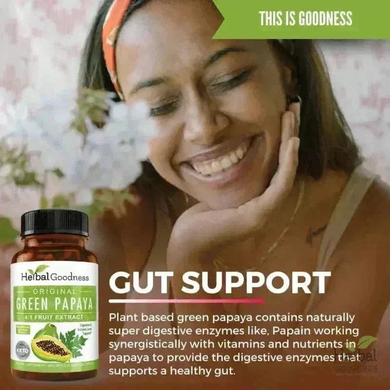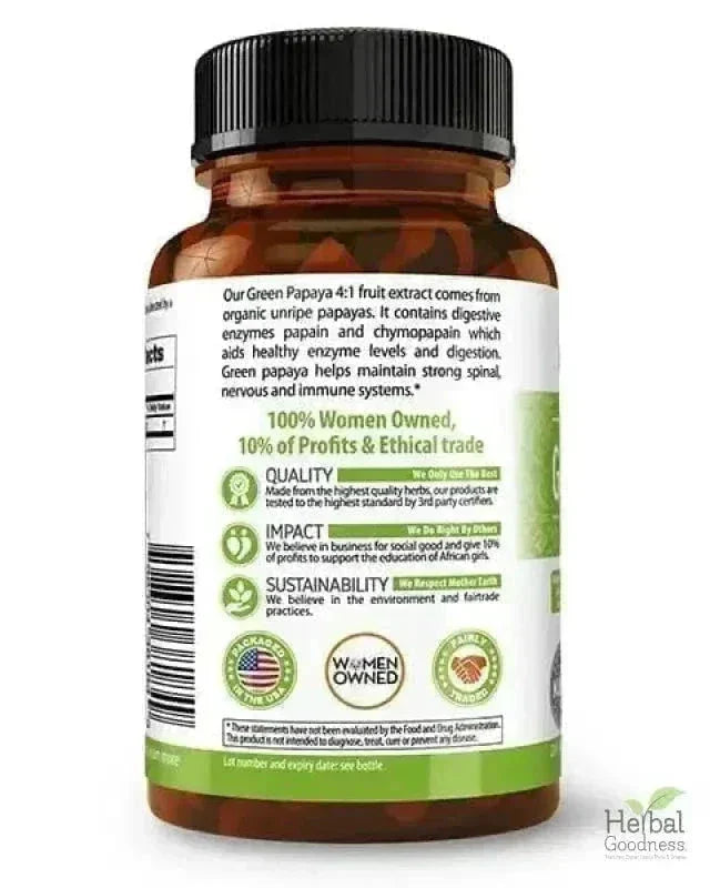 Gut Digest β Papaya Green Fruit Extract is a plant-based supplement made from unripe green papaya, encapsulated in 100% vegetarian pullulan capsules. Green papaya, traditionally used in various cultures, is known for its naturally occurring enzymes and fiber content. Each capsule delivers 600 mg of green papaya extract in a 4:1 strength formulation.
